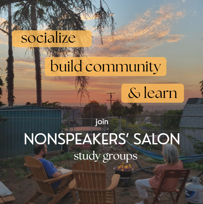 NONSPEAKERS’ SALON study groups: Gatherings for nonspeakers to build community and engage with high-level intellectual materials. In-person, hybrid options.